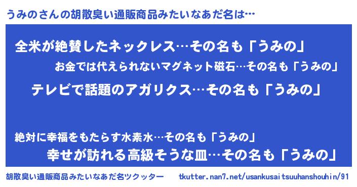 | ヘコむあだ名 | 『うみっ子』『なまこ酢』『うみにー』 |
