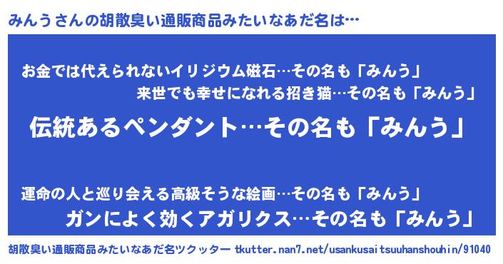 | 意味不明あだ名 | 『とにかく怪しいみんう』『自称みんう』 |