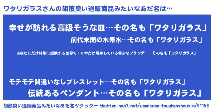 | 女子向けラノベタイトル風あだ名 | 『悪役ワタリガラスに転生したようですが、知った事ではありません』 |