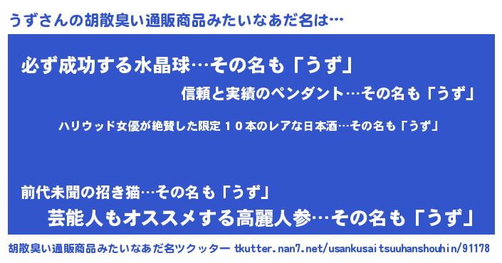 | 意味不明あだ名 | 『住所不定無職うず(40歳)』『ペロリンうず』 |