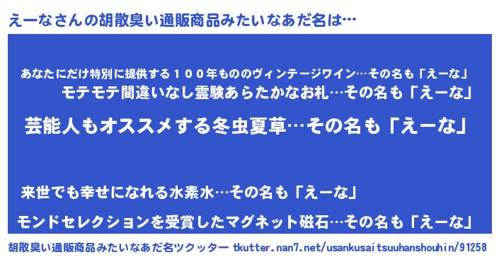 | 男性向けラノベタイトル風あだ名 | 『Re:えーなから始める異世界生活』 |
