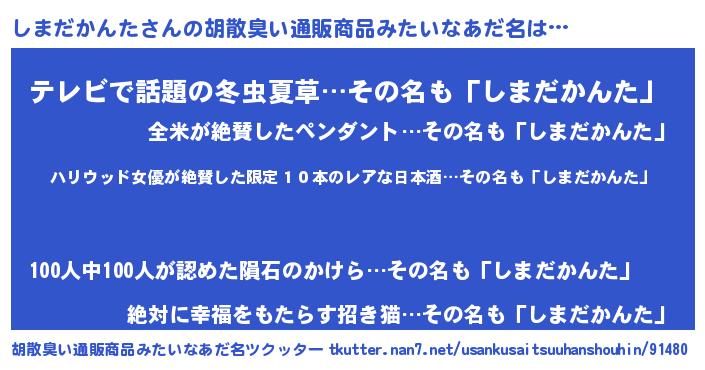 | 意味不明あだ名 | 『住所不定無職しまだかんた(68歳)』 |