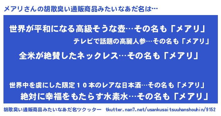 | 男性向けラノベタイトル風あだ名 | 『メアリに滅ぼされるだけの簡単なお仕事です』 |