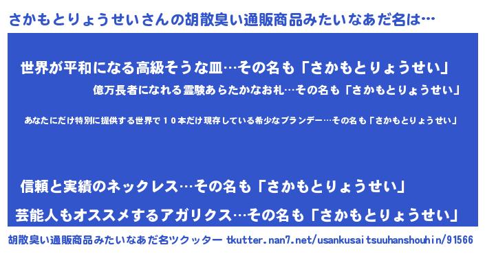 | 意味不明あだ名 | 『住所不定無職さかもとりょうせい(71歳)』 |