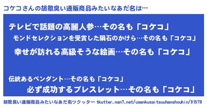| 男性向けラノベタイトル風あだ名 | 『コケコスレイヤー』『コケコの憂鬱』 |