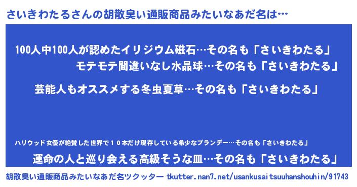 | 男性向けラノベタイトル風あだ名 | 『さいきわたるに滅ぼされるだけの簡単なお仕事です』 |