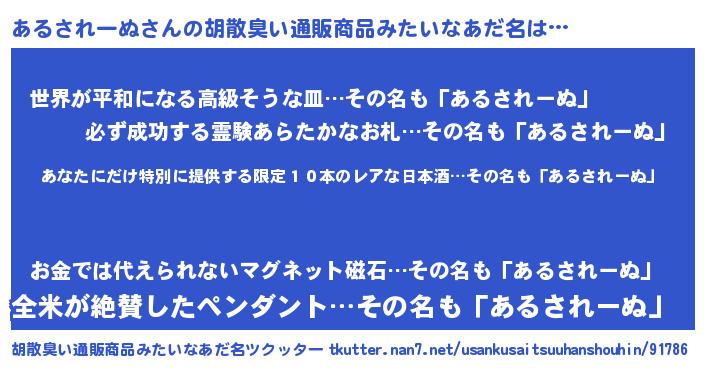 | 意味不明あだ名 | 『住所不定無職あるされーぬ(56歳)』 |