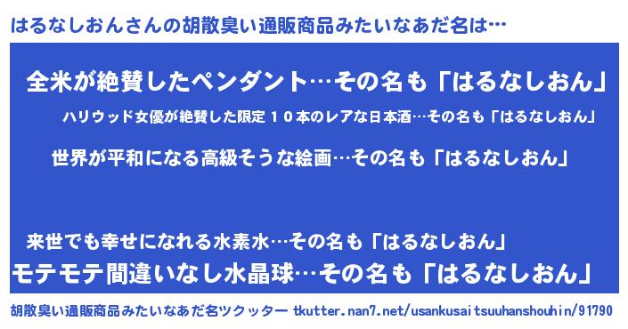 | 男性向けラノベタイトル風あだ名 | 『転生したらはるなしおんだった件』 |