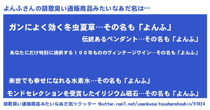 | 意味不明あだ名 | 『住所不定無職よんふ(10歳)』『自称よんふ』 |