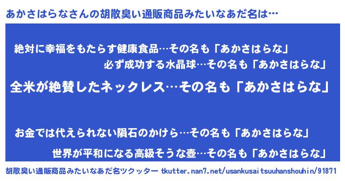 | 男性向けラノベタイトル風あだ名 | 『あかさはらなの嫁は女の子じゃないと思った?』 |