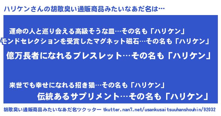 | ファンタジー風あだ名 | 『ハリフェル』『エターナルハリケンー』 |