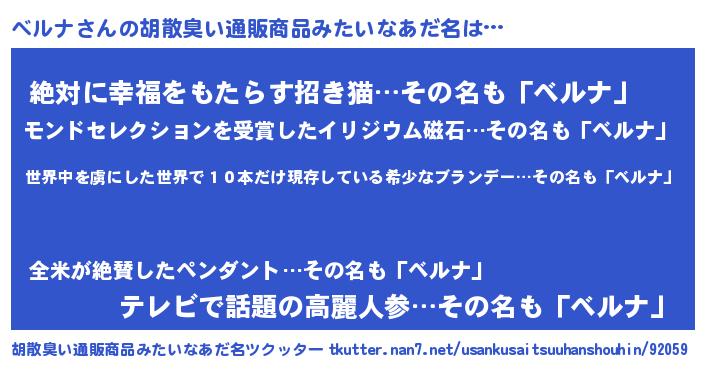 | 意味不明あだ名 | 『住所不定無職ベルナ(84歳)』『自称ベルナ』 |