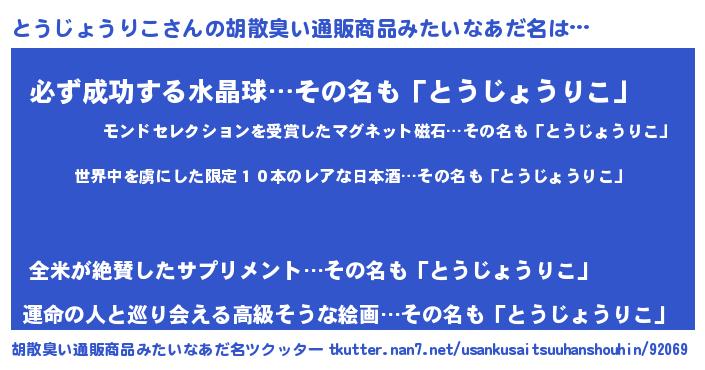 | 意味不明あだ名 | 『住所不定無職とうじょうりこ(43歳)』 |