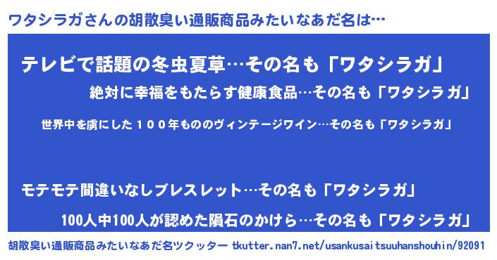 | 意味不明あだ名 | 『住所不定無職ワタシラガ(2歳)』 |