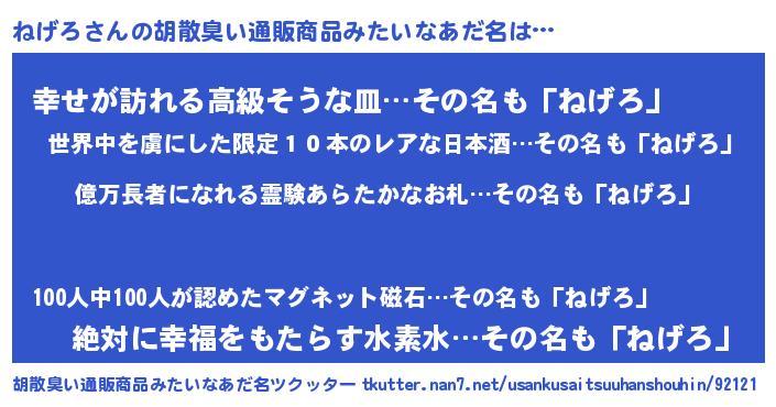 | 男性向けラノベタイトル風あだ名 | 『ねげろに滅ぼされるだけの簡単なお仕事です』 |