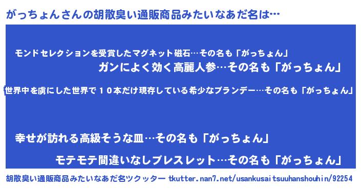 | ヒーロー風カッコイイあだ名 | 『仮面ガッダー』『慈愛の使者がっちょん』 |