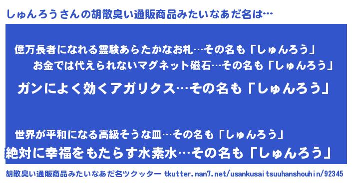 | 意味不明あだ名 | 『自称しゅんろう』『ペロリンしゅんろう』 |