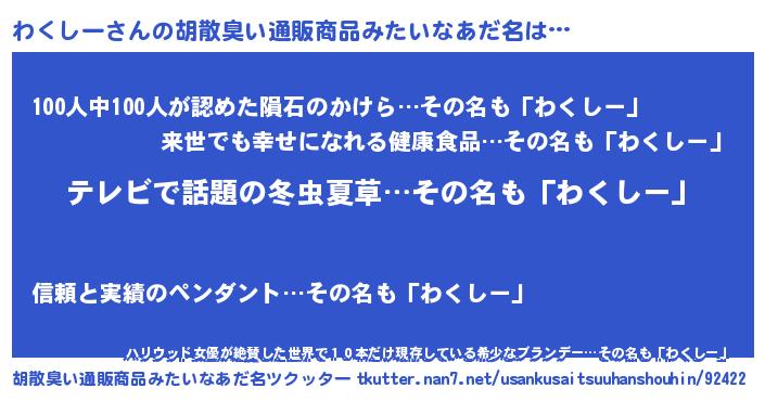 | 男性向けラノベタイトル風あだ名 | 『Re:わくしーから始める異世界生活』 |