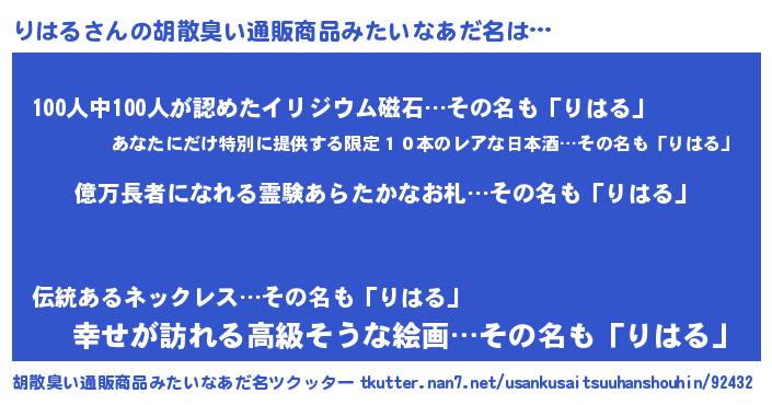 | ヘコむあだ名 | 『りはっふぃ~』『つくし』『りはお』 |