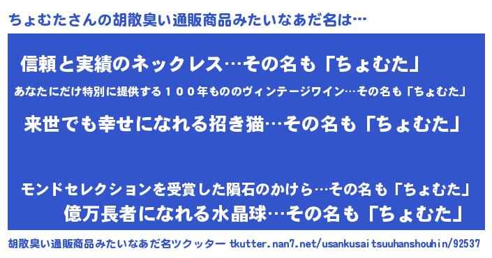 | 男性向けラノベタイトル風あだ名 | 『ちょむたという概念が存在しない退屈な世界 』 |