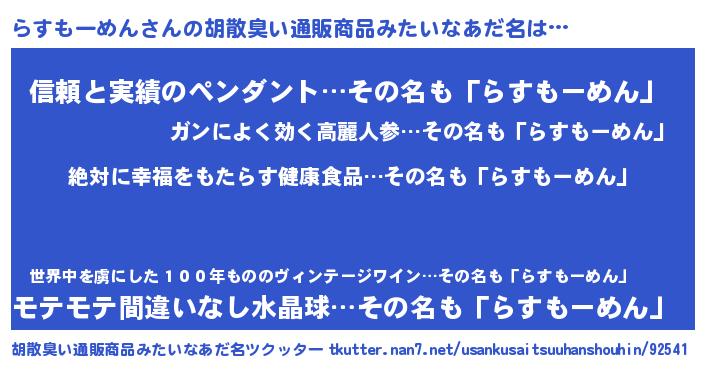 | 男性向けラノベタイトル風あだ名 | 『らすもーめんという概念が存在しない退屈な世界 』 |