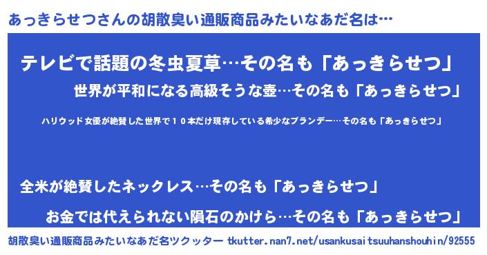 | 意味不明あだ名 | 『住所不定無職あっきらせつ(74歳)』 |