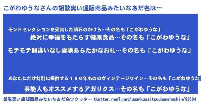 | ヘコむあだ名 | 『こがっふぃ~』『こがわゆうな(笑)』 |