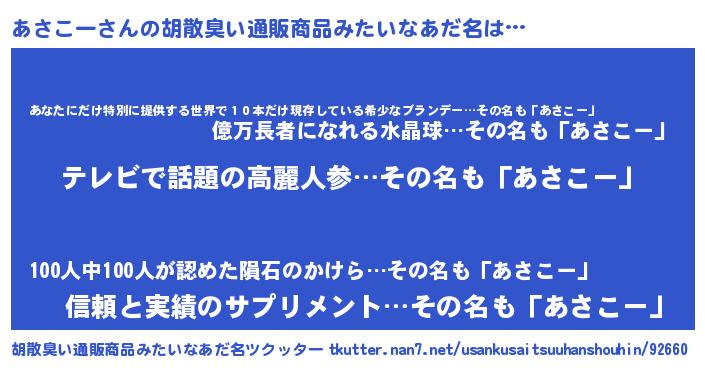 | ヘコむあだ名 | 『あさお』『あさもー』『つくし』 |