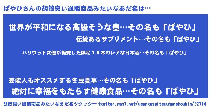 | 意味不明あだ名 | 『住所不定無職ばやひ(39歳)』『自称ばやひ』 |