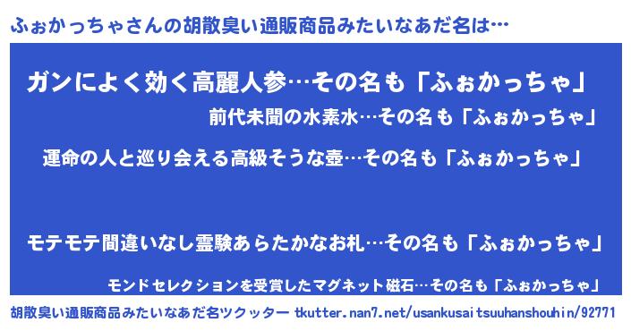 | 男性向けラノベタイトル風あだ名 | 『ふぉかっちゃ~年齢イコール彼女いない歴の魔法使い~』 |