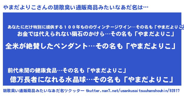 | 男性向けラノベタイトル風あだ名 | 『やまだよりこの嫁は女の子じゃないと思った?』 |