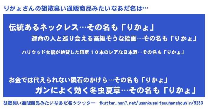 | 意味不明あだ名 | 『住所不定無職りかょ(56歳)』『自称りかょ』 |