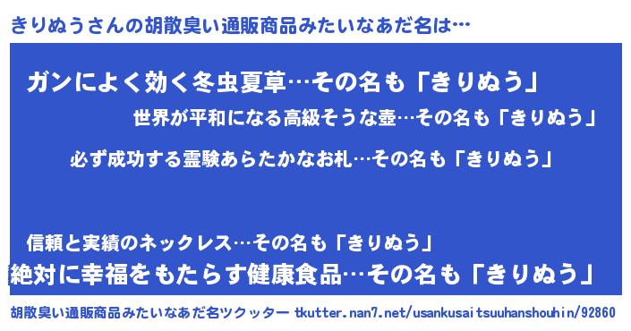 | 男性向けラノベタイトル風あだ名 | 『キリヌウスレイヤー』『きりぬうの憂鬱』 |