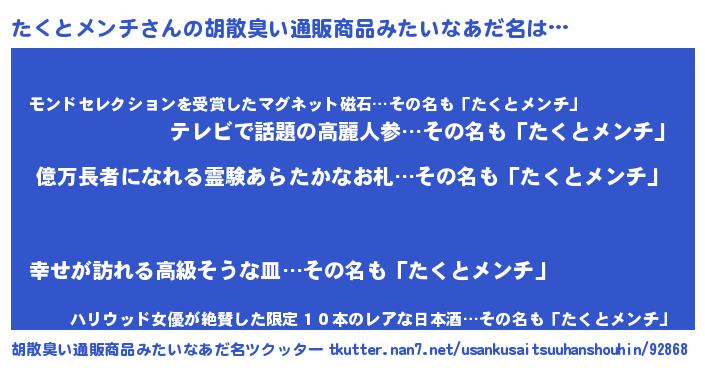 | 欧米人風あだ名 | 『アンジェラ・たくとメンチ』 |