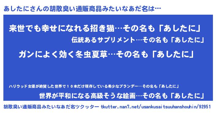 | 意味不明あだ名 | 『自称あしたに』『永久保存あしたに』 |