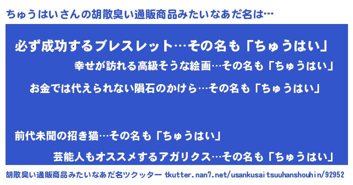 | ヘコむあだ名 | 『ちゅもー』『つくし』『ちゅっぺ』 |
