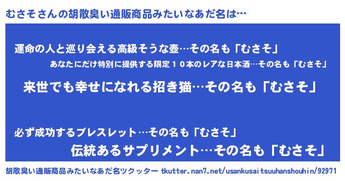| ヘコむあだ名 | 『むさそ(小並感)』『酢こんぶ』 |