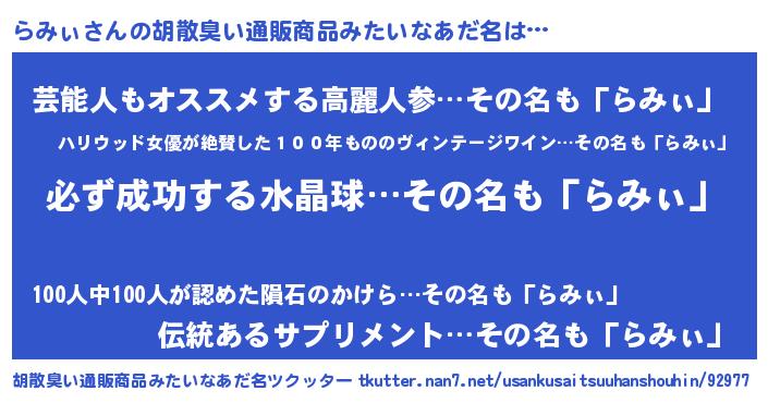 | ヘコむあだ名 | 『らみにゅー』『らみっぺ』『豆乳』 |