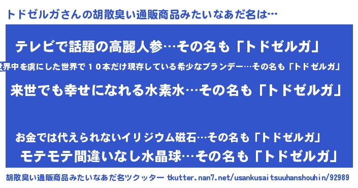 男性向けラノベタイトル風あだ名 | 『トドゼルガという概念が存在しない退屈な世界 』 |
