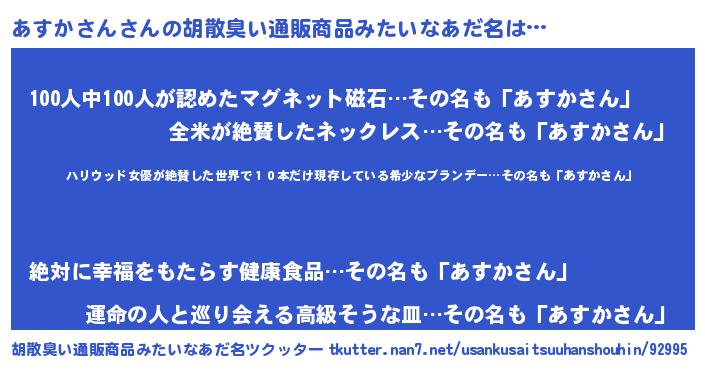 | ヒーロー風カッコイイあだ名 | 『仮面アスダー』『正義の使者あすかさん』 |