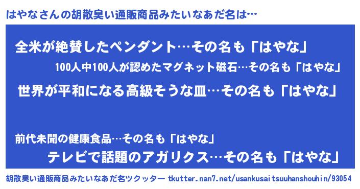 | 欧米人風あだ名 | 『アンジェラ・はやな』『ウサインはやな』 |