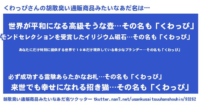 | 意味不明あだ名 | 『住所不定無職くわっぴ(77歳)』 |
