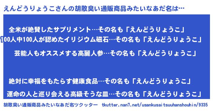 | 男性向けラノベタイトル風あだ名 | 『Re:えんどうりょうこから始める異世界生活』 |