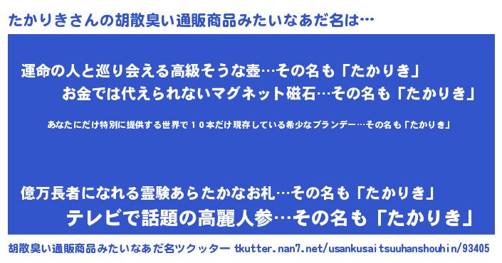 | 意味不明あだ名 | 『住所不定無職たかりき(84歳)』 |