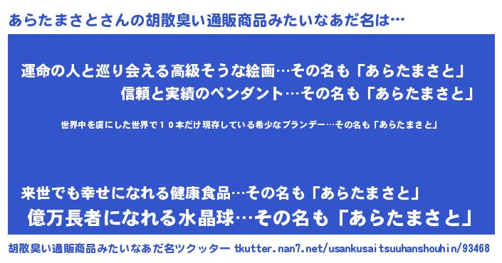 | 男性向けラノベタイトル風あだ名 | 『この素晴らしい世界にあらたまさとを!』 |