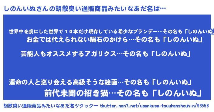 | 男性向けラノベタイトル風あだ名 | 『Re:しのんいぬから始める異世界生活』 |