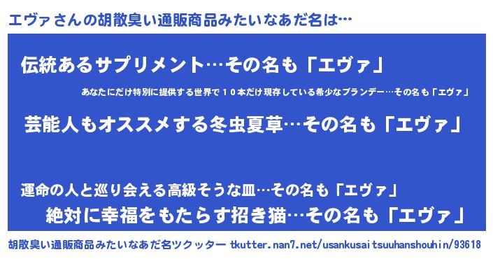 | 男性向けラノベタイトル風あだ名 | 『Re:エヴァから始める異世界生活』 |