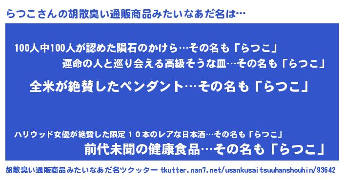 | 男性向けラノベタイトル風あだ名 | 『うちのらつこが世界を掌握している!』 |