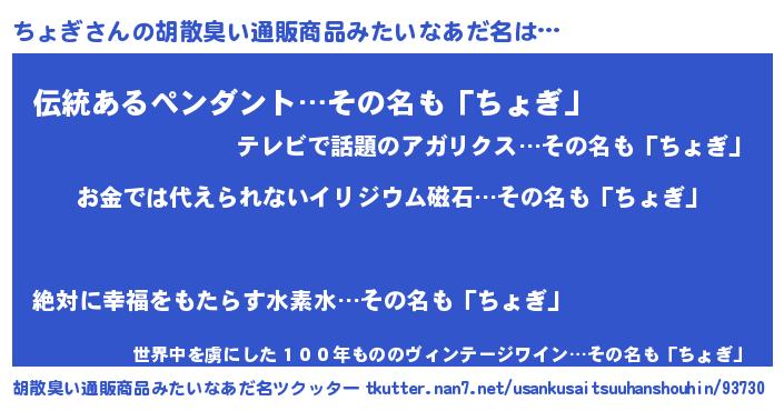 | 男性向けラノベタイトル風あだ名 | 『転生したらちょぎだった件』 |
