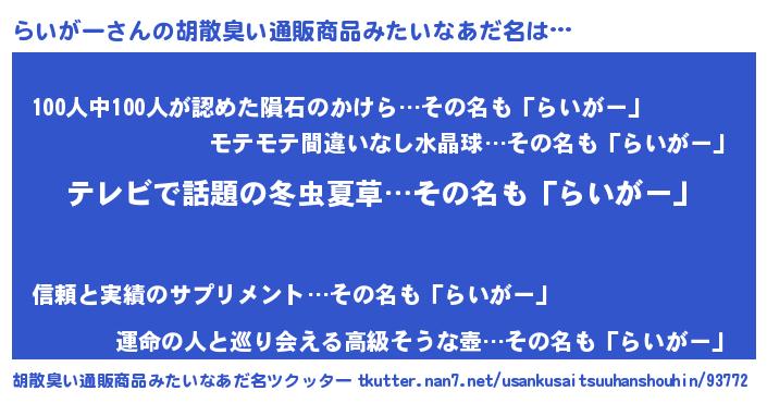 | 意味不明あだ名 | 『自称らいがー』『らいがーフォーエバー』 |